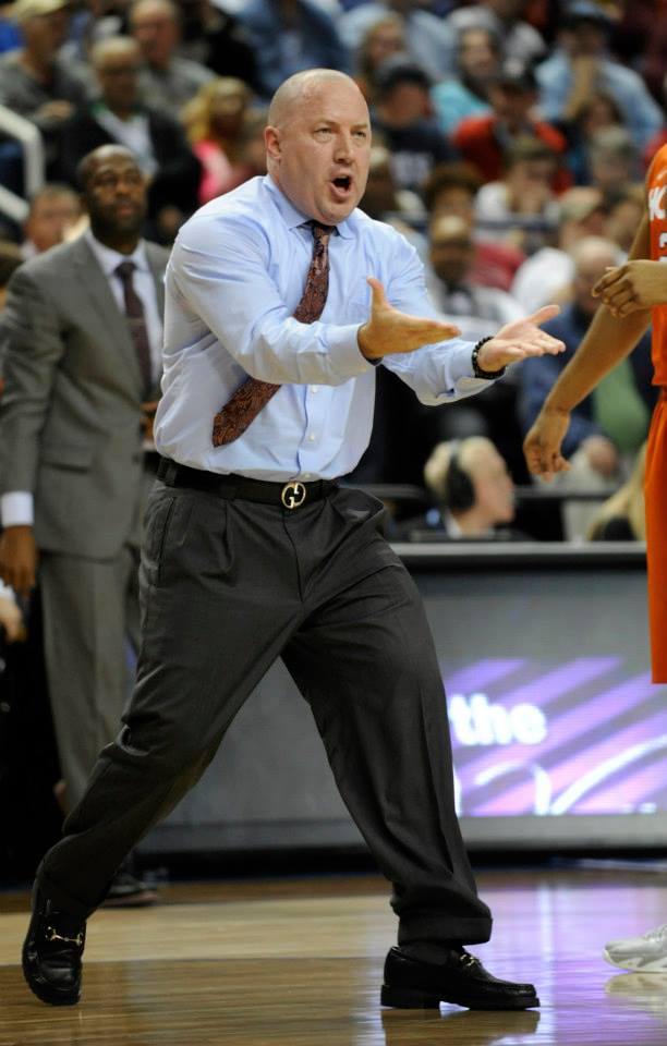 Buzz Williams shouts encourgement to his young Hokies squad in his first ACC Tournament game