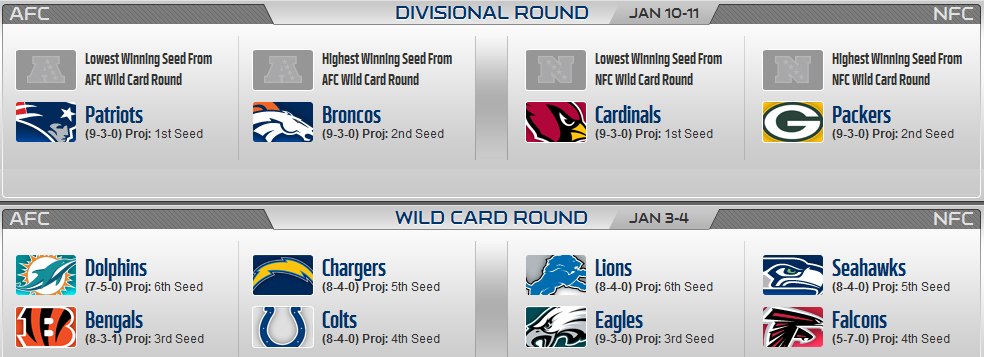 4 seed: New Orleans wins the NFC South at 8-8 and earn the #4 seed. Their record could potentially be 9-7, but the edge goes to Chicago at home in week 15.