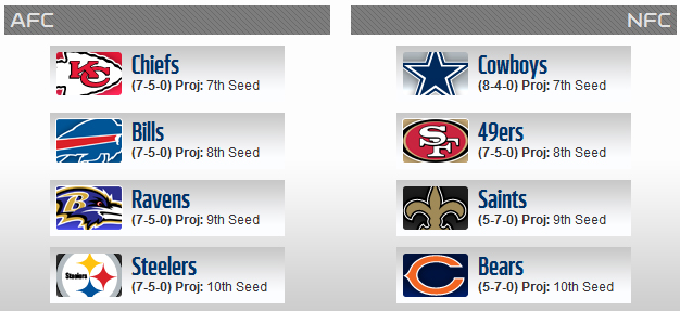 The current playoff picture following week 13, including remaining contenders for the Wild Card spots in each conference, stands as follows: